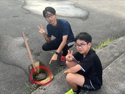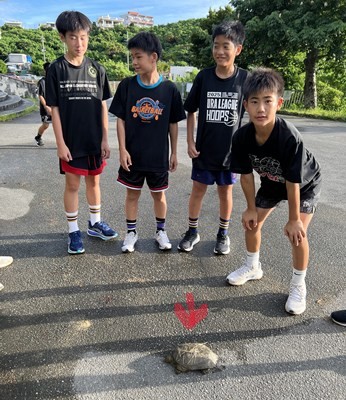 自然豊かな浦西中学校には、様々な生物が訪れます。玄関前のホウオウボクにはリュウキュウアオバズクが毎年のように姿を見せてくれます。朝練中のバスケ部が発見したのは野生のスッポンでした。生徒に危険が及ばないように川に返したようです。