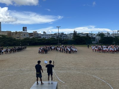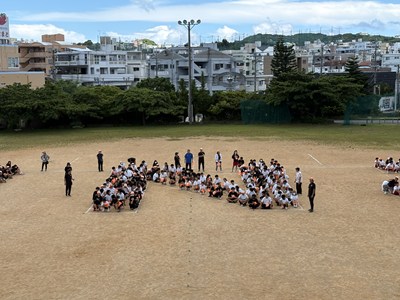 3年間毎年同じ位置を受け持つ、浦西中恒例の人文字の練習が行われました。1年生は初めての全体練習なので、自分の地位を確認しながら場所を覚えました。High祭本番ではドローンを飛ばします!みんなで手を振る練習までバッチリです!