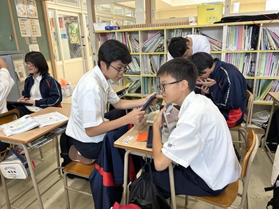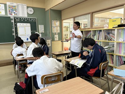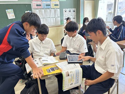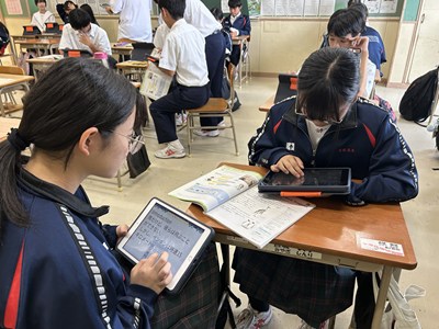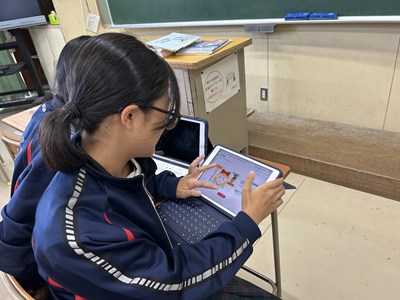 2年2組の英語の授業で、グループで教科書にあるペンギンについての情報を整理し、その情報をもとにタブレットでモニカとペンギンについて英語で会話をする授業を行っていました。タブレットの中のモニカは一人一人の音声を聴き分けて返事をしてくれるキャラクターです。逆に質問をされるので会話が続いていきます。英語でのアウトプットの量を多くしていく取り組みですね。