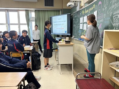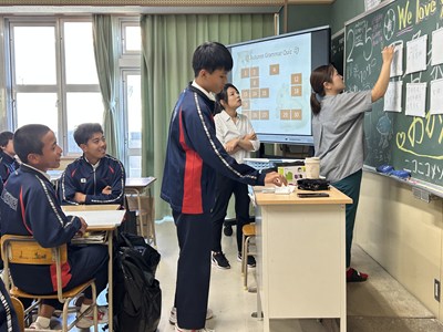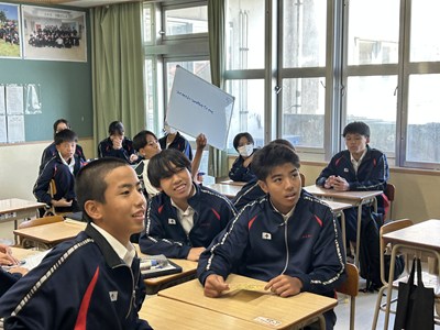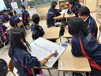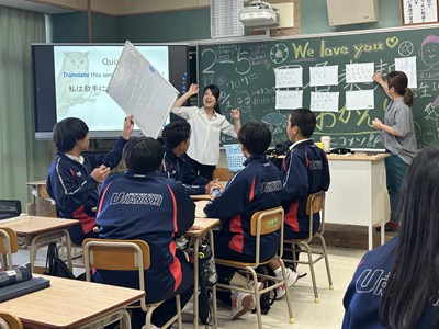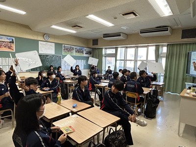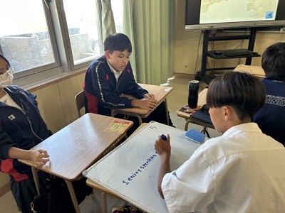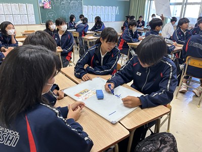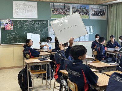 2年5組の英語の授業でグループで楽しそうにゲーム対決している様子を参観しました。これまで身に付けた英文法を活用してホワイトボードに文章表現するクイズ形式のビンゴゲームでした。祥子先生とリン先生の進行で30ある問題にチャレンジします。グループ対抗なので楽しそうに協力してボードを高く上げていました。