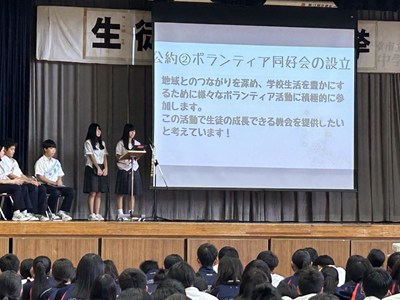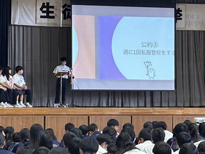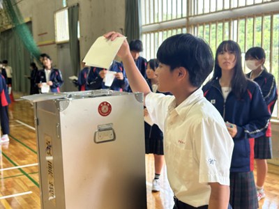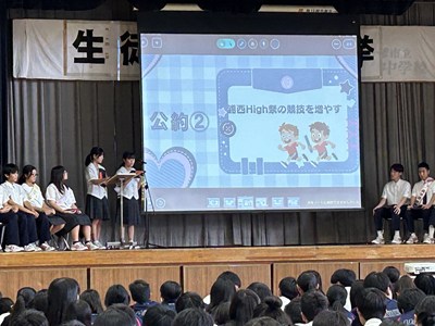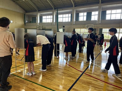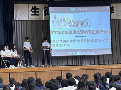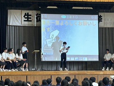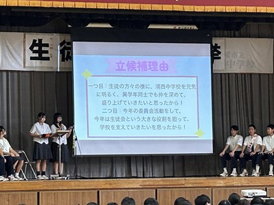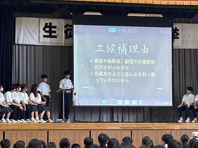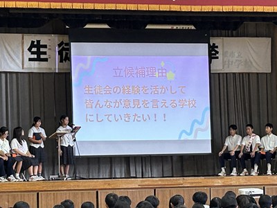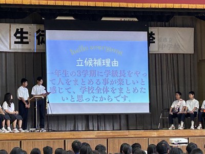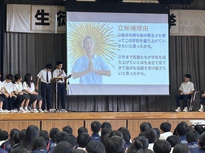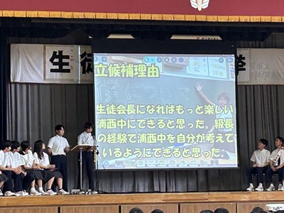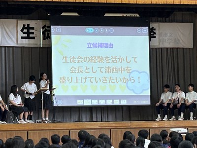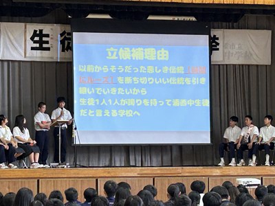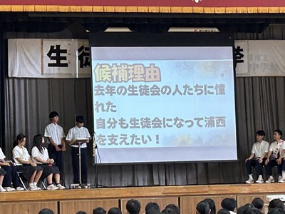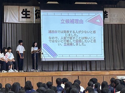 本日午後、次期生徒会会長・副会長選挙が行われました。立候補者と推薦人がそれぞれ演説を行い、その後全校生徒による投票が行われました。浦西中学校をよりよくするために、2年生14名の会長候補者、1年生5名の副会長候補者が公約を述べました。今よりもっと進化・深化する生徒会活動にますます期待が高まります。