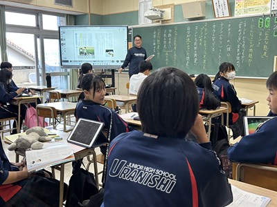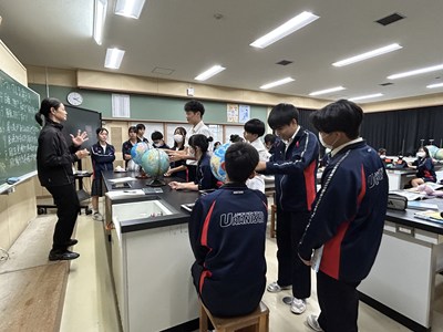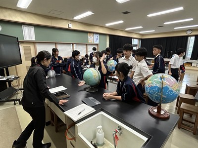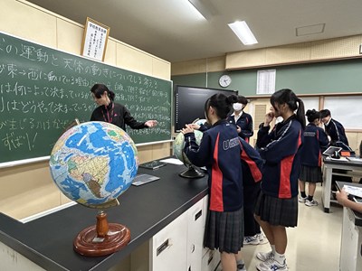 地球の運動と天体の動きについて、直接見えないし動かせない現象を本物の理解に変えるために、しっかりと言葉で表現させています。9つの問いの中から選んで真紀子先生や友達の前で地球儀を動かしながら一生懸命説明する姿がさすが3年生だと感心しました。また2年5組では、生徒指導の周史先生が「公正な態度」について弾んだ声で道徳の授業を行っていました。毎日の生活の中で、私たちは常に公正や公平でいられるでしょうか?しっかりと考えていきたいものです。