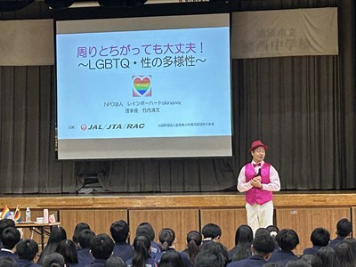 本日、性の多様性啓発講座が実施されました。早朝より講師としていらしてくださったのはレインボーハートokinawa理事長の竹内清文さんです。寒い体育館の空気を一瞬で明るくするようなあたたかい雰囲気でお話をしてくださいました。思春期の浦西中生も集中して臨んでいます。一番大事なことは一人一人の心の安全が保たれること。学校という場所がみんなが自分らしくいられる場所であること。浦西中全体でそのような環境をつくっていきましょうね!
