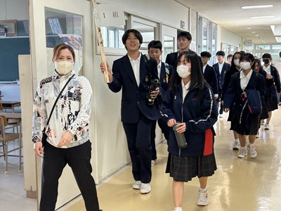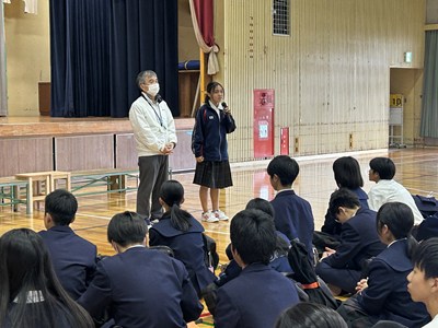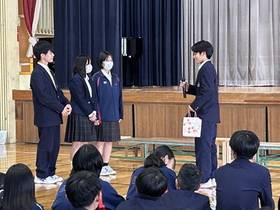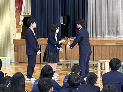 修学旅行まであと12日です。周史先生の指揮で2年生は集合整列、点呼、記念撮影、歩行訓練と一連の流れを体育館で練習しました。3年生から絵馬を預かり太宰府天満宮に奉納するための贈呈式を行いました。3年生全員の合格をしっかりと祈願してきますね!
