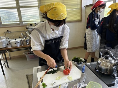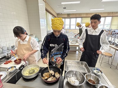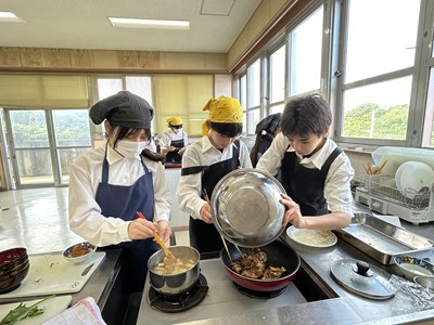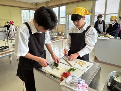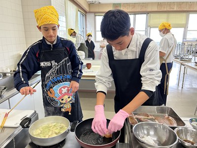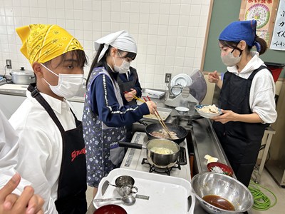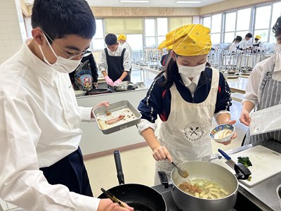 家庭科の授業で豚の生姜焼きやみそ汁の調理実習が行われています。エプロン・三角巾姿の1年生が作り方を片手に役割を分担して頑張りました。油がはねてあわてている姿もかわいいです。美味しくできたらいいですね!