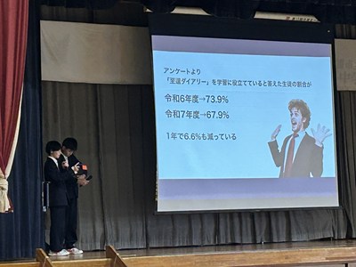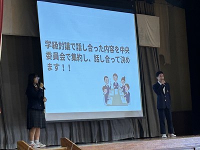 新生徒会になって初めての生徒会朝会が行われました。新生徒会長による朝のあいさつや司会進行、各委員会からの提案や会長・副会長によるライブトークなど、3年生から引き継いで頑張る様子がとても新鮮でした。