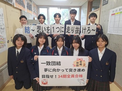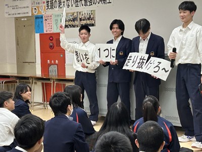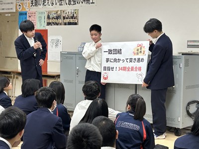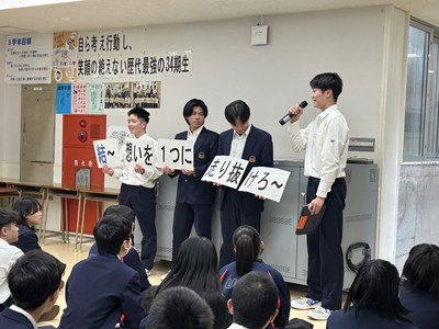 明日の進路決定に向けて、3年生が集会を行いました。卒業に向けての想いや受検に向けての決意を共にし、浦西中34期が残りの中学校生活をさらに充実させていきます。「結~想いを一つに走り抜けろ~」